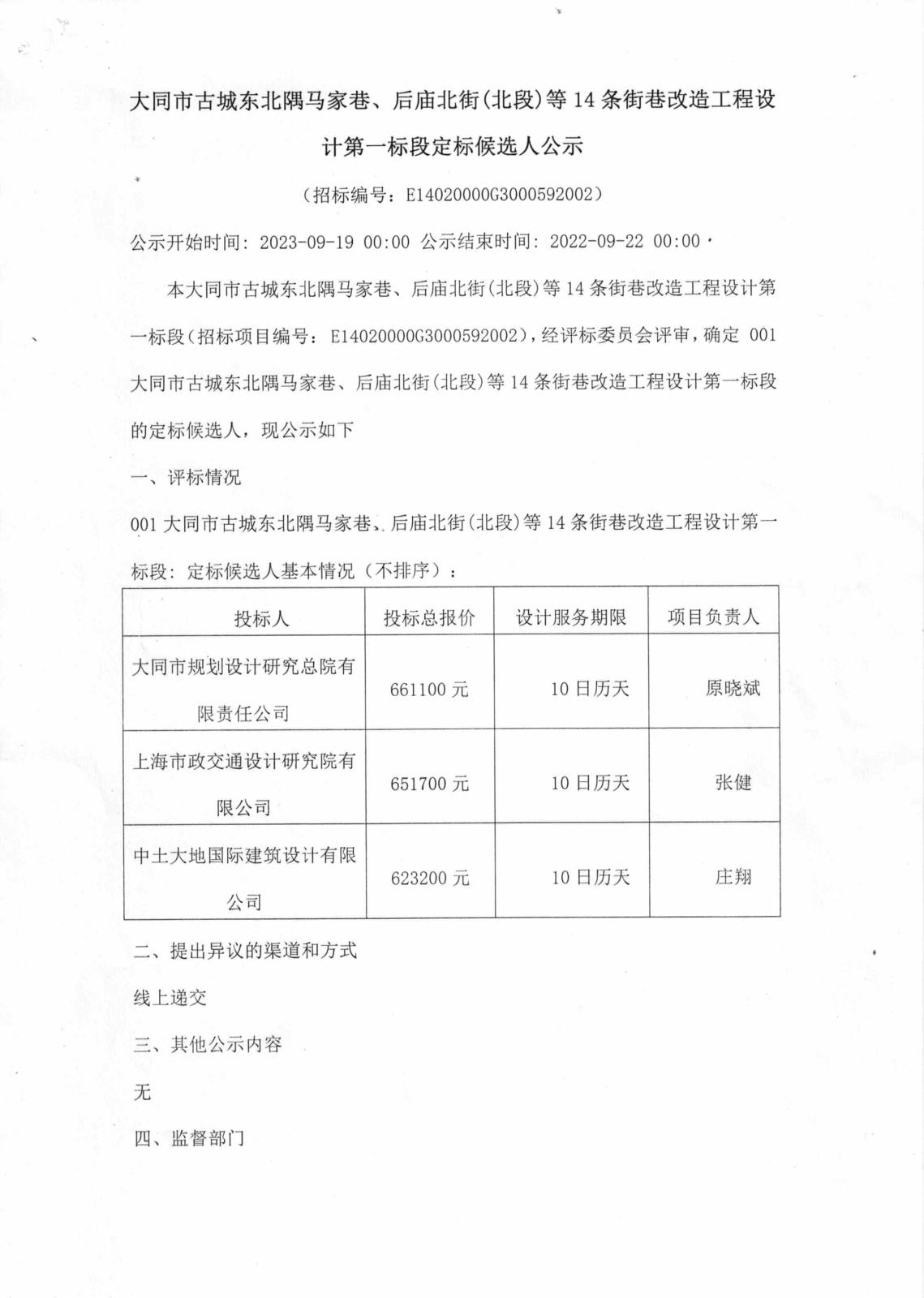 大同市古城东北隅马家巷、后庙北街(北段)等14条街巷改造工程设计第一标段候选人公示