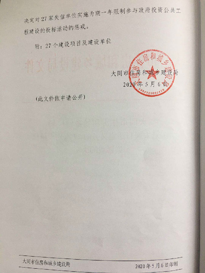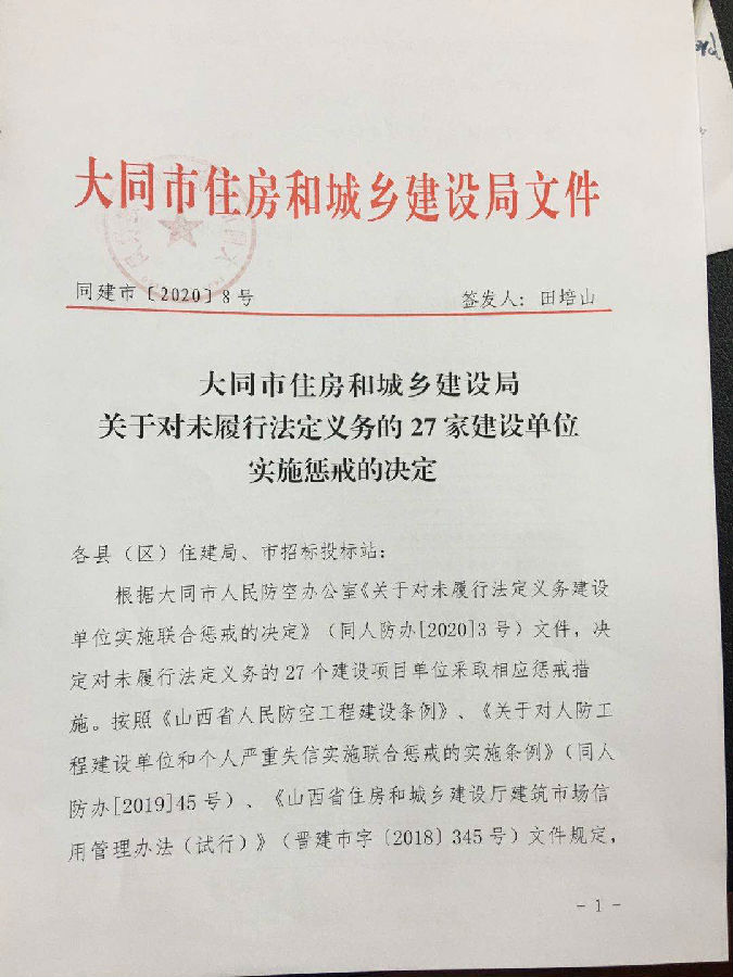 大同市住房和城乡建设局关于对未履行法定义务的27家建设单位实施惩戒的决定